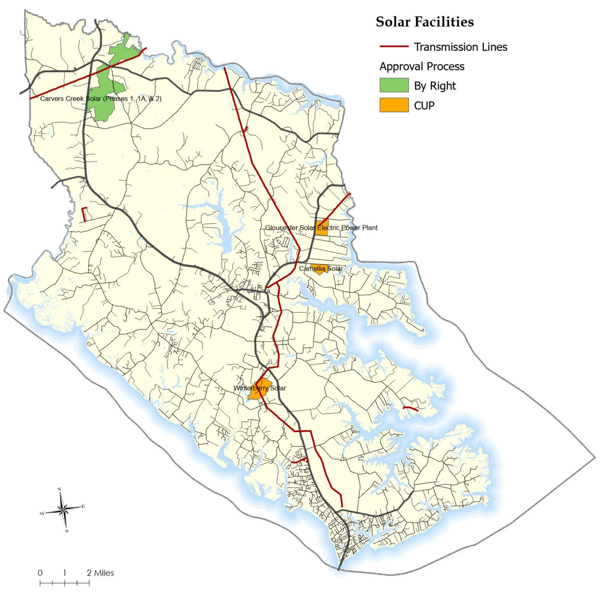 Since initial adoption of a solar ordinance, the Board of Supervisors has approved four utility-scale solar energy facilities through the CUP process: the Gloucester Solar Electric Power Plant (2017), Winterberry Solar facility (2020), Cow Creek Solar facility (2020), and Camellia Solar facility (2021). In addition, prior to requiring a CUP for utility-scale solar energy facilities in the RC-1 district, the Carver’s Creek Solar facility received preliminary site plan approval as a by-right use in this district in 2020. This preliminary site plan approval and subsequent final site plan approvals for Phases 1, 1A, and 2 (Phas 3 since expired) have established the right for this facility to be developed in this district.