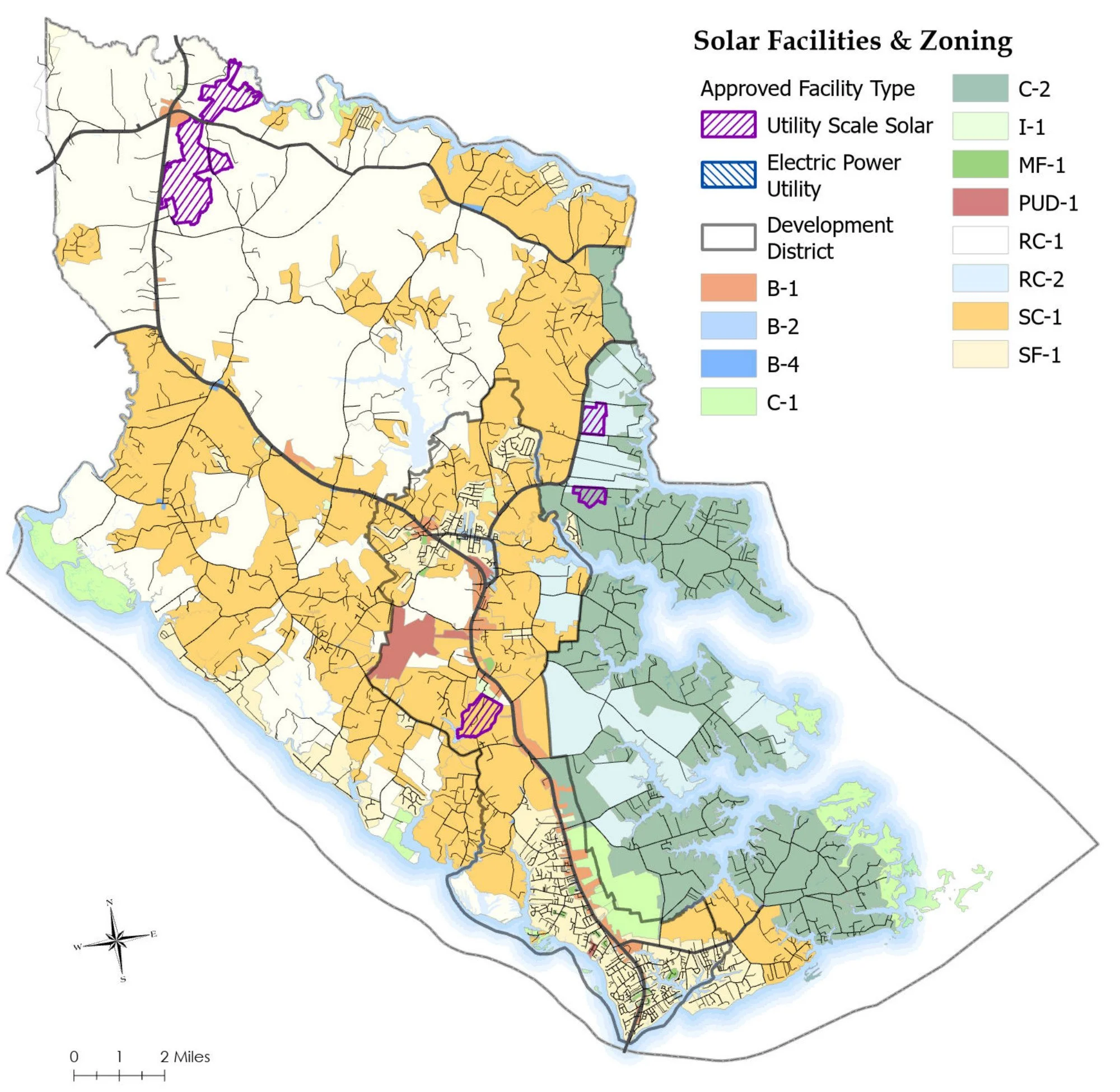The Zoning Ordinance has been revised several times since its initial adoption of a solar ordinance in 2015. Utility-scale solar energy facilities were initially permitted by Conditional Use Permit (CUP) in all districts except the RC-1 district (where it was permitted as a by-right use). Subsequent amendments to the solar ordinance have resulted in these facilities being permitted only in the SC-1 and RC-1 district by CUP with a maximum of 2% of the acreage of each of these districts permitted to be used for solar energy facilities. In addition, these subsequent amendments have established additional standards for utility-scale, community-scale, and large-scale facilities, such as site plan and decommissioning plan requirements (including sureties), setbacks, buffering requirements, and supplemental CUP application requirements. The table below provides a breakdown of the total acreage permitted in each district and the remaining acreage available for solar development.